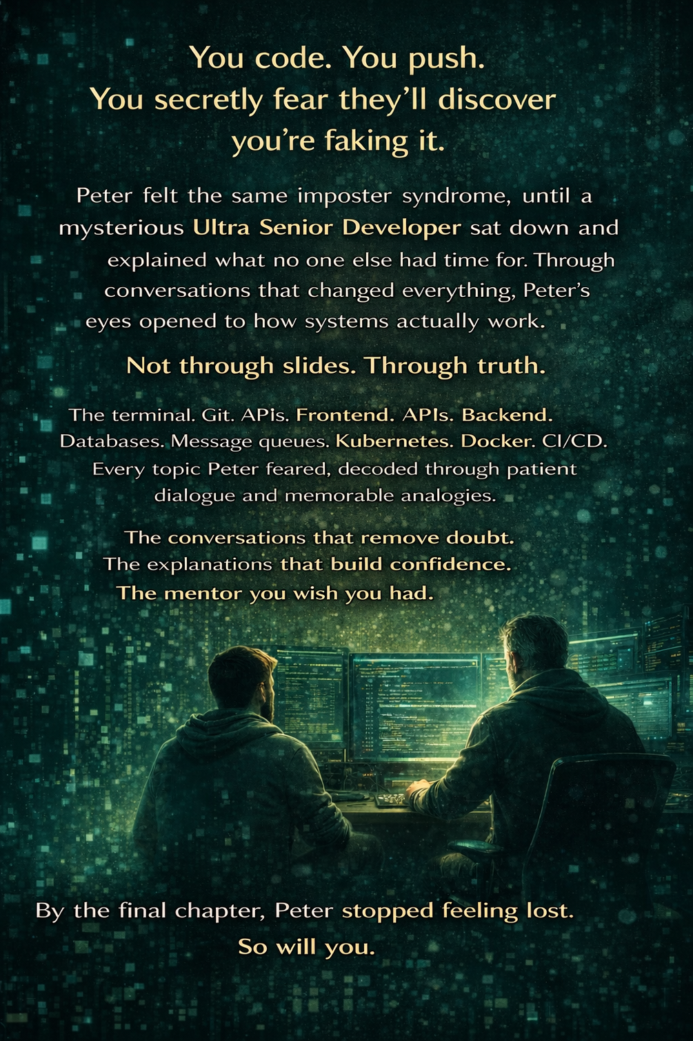 You push. You secretly fear they'll discover you're faking it. Peter felt the same imposter syndrome, until a mysterious Ultra Senior Developer sat down and explained what no one else had time for. Through conversations that changed everything, Peter's eyes opened to how systems actually work. Not through slides. Through truth. The terminal. Git. Frontend. APIs. Backend. Databases. Message queues. Kubernetes. Docker. CI/CD. Every topic Peter feared, decoded through patient dialogue and memorable analogies. The conversations that remove doubt. The explanations that build confidence. The mentor you wish you had. By the final chapter, Peter stopped feeling lost. So will you. update it with this.